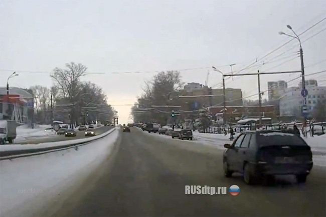 Девушка на ВАЗ-2109 должна была беспрепятственно пересечь перекресток, зеленый только раз и успел мигнуть перед пересечением, однако нашелся умник, который выехал на красный… В конце видео видно, как девушка буквально вываливается из разбитой девятки, весь вопрос в том, была ли пристегнута. Кстати, ехать ей можно было бы и помедленнее, авось алень с пересечения ее увидел и пропустил…