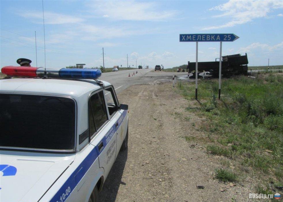 По предварительным данным, водитель ВАЗ-2111 при движении в г.Оренбург выехал на встречную полосу и столкнулся с КамАЗом который двигался в попутном направлении и выполнявшего поворот \»налево\» к поселку Хмелевка. Удар, пришедшийся в топливный бак КамАЗа. После удара автомобили развернуло практически на 90 градусов.