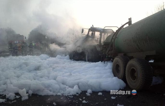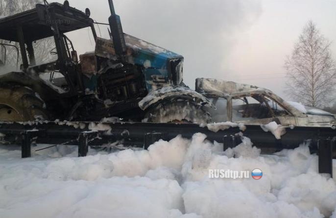 По предварительным данным на повороте у д.Светоч 56-летний водитель автомобиля Audi A6 выехал на обгон, но не успел вернутся на свою полосу и столкнулся с трактором МТЗ, под управлением 24-летнего водителя. После столкновения оба транспортных средства сразу же загорелись. Водитель легковушки погиб на месте. Тракторист в аварии не пострадал.