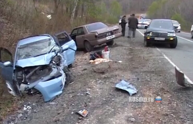 Приморье. В районе лагеря \»Юнга\» водитель Тойоты Краун, который двигался по трассе в сторону Артема, при прохождении поворота зацепил колесом обочину, машину занесло и выбросило во встречную Хонду Фит, также по касательной зацепили еще одну Тойоту.