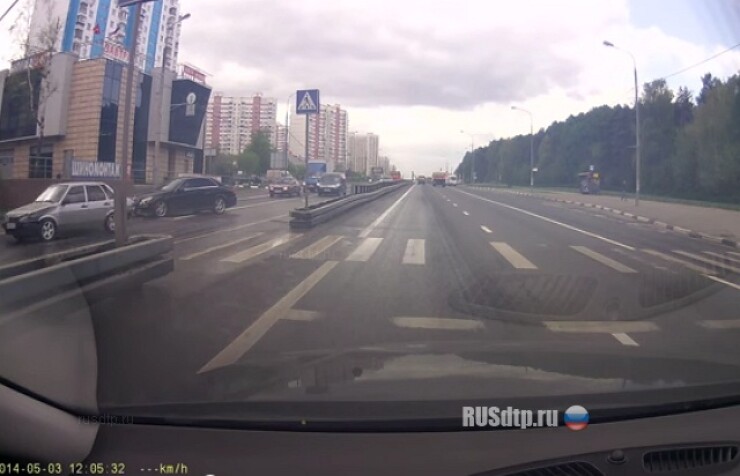 3 мая. Москва, Ново-Переделкино. Автор пишет: \»Молодой парень на жигулях не соблюдал скоростной режим и дистанцию, перед красным светофором летел за мерсом, когда началось торможение — хотел заехать на другую полосу, стать первым, но мерс одновременно с ним начал перестроение. Из-за высокой скорости и отсутствие дистанции парень выбрал влететь в отбойник, а не в машину. Походу пьяный. Время 12:05.\»