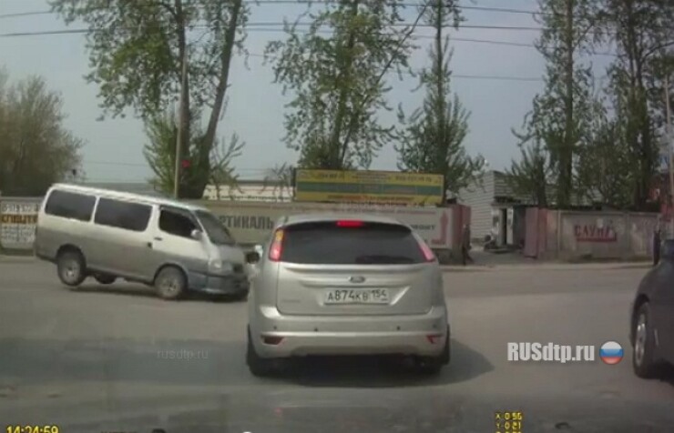9 мая, Новосибирск, улица Кутателадзе. Водитель легковушки решил, что успеет повернуть налево перед встречным микроавтобусом.