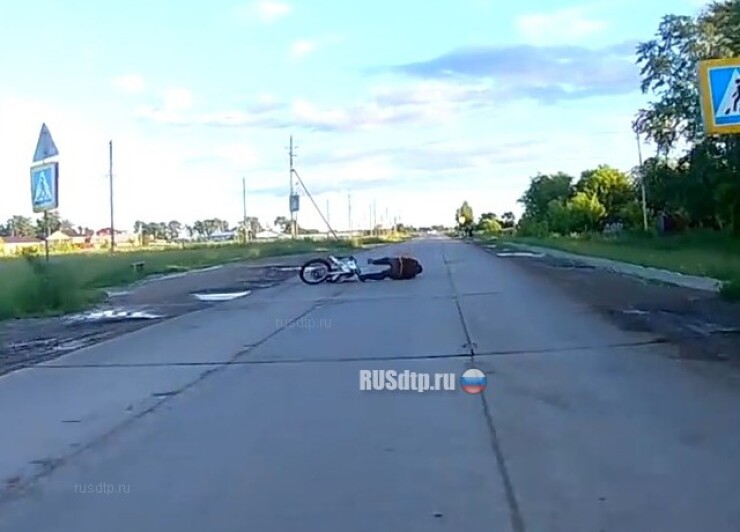 Падение с мотоцикла в Омске. По словам автора, водитель жив, здоров, завел и поехал дальше.