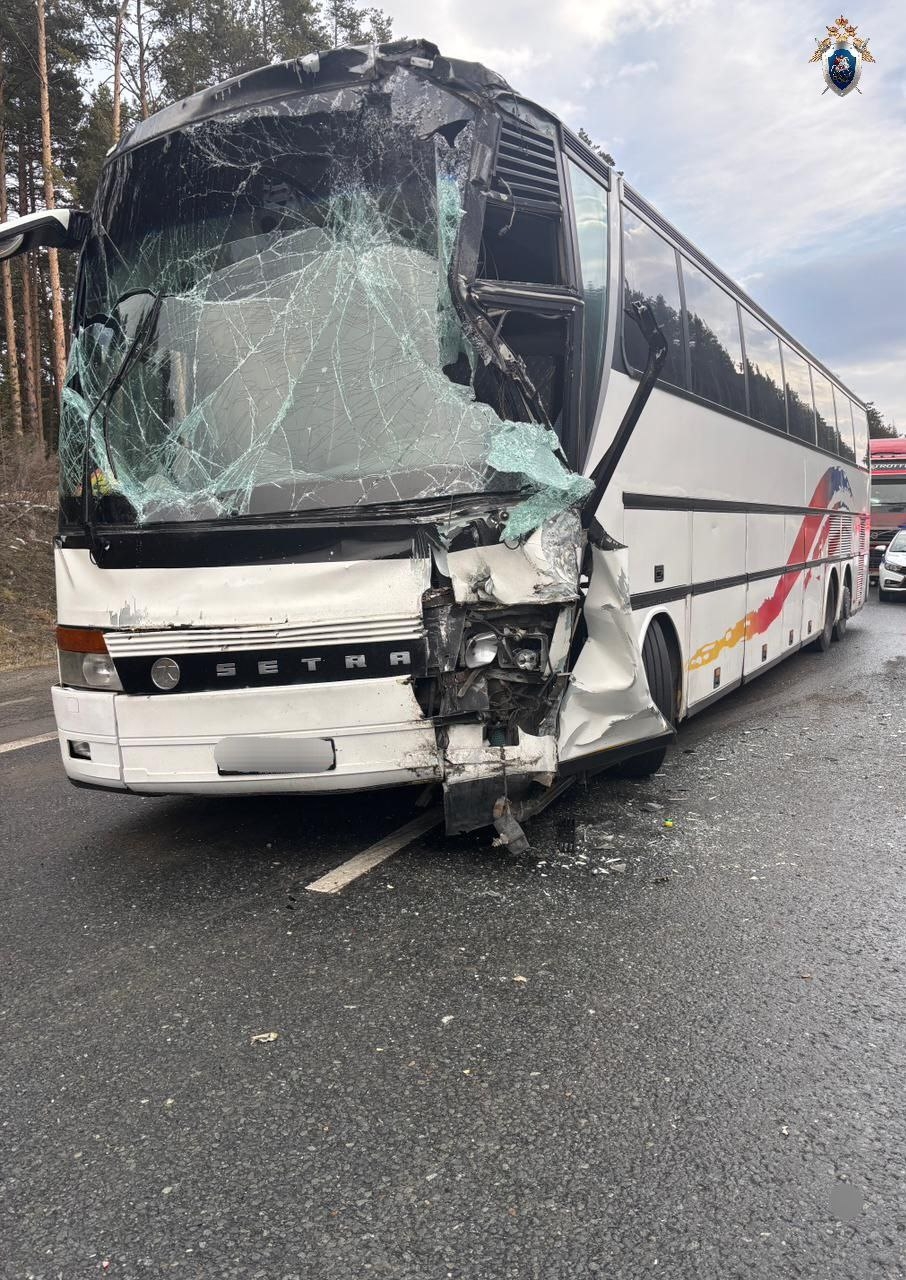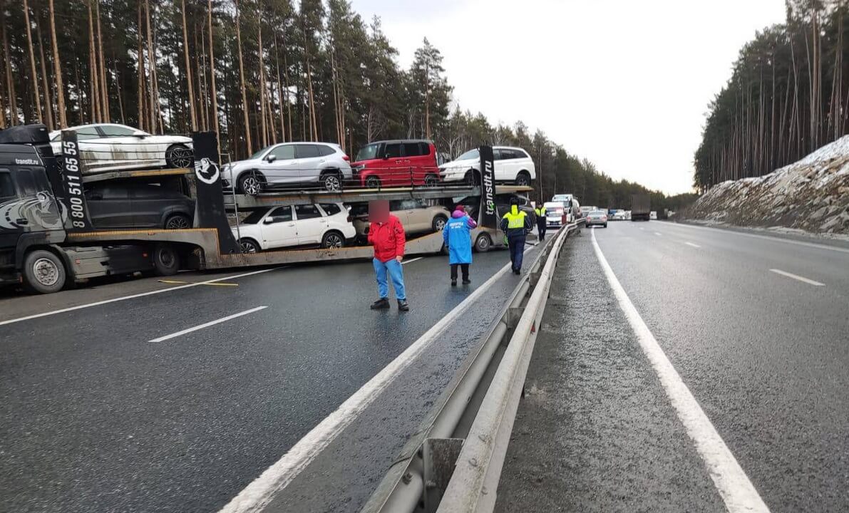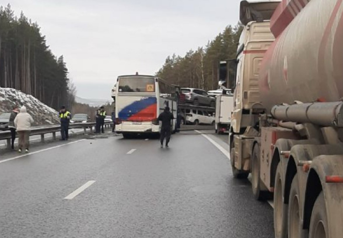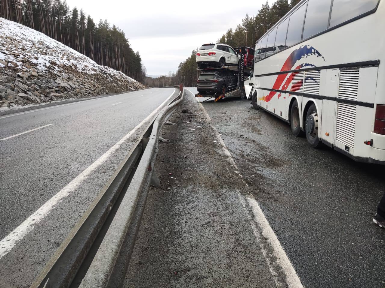 ДТП произошло 14 ноября на трассе М-5 в Челябинской области. Водитель автобуса не выбрал безопасную скорость и столкнулся с автовозом, который незадолго до этого занесло на скользкой дороге.