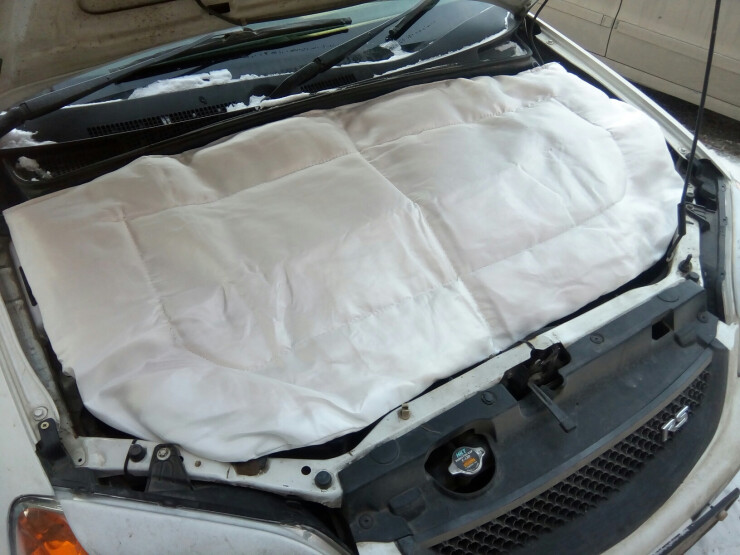 По словам Шкуматова, подкапотное автоодеяло изготавливается из базальтового волокна – традиционного, негорючего утеплителя. Основная задача этого приспособления – предотвратить потерю тепла через крышку капота.