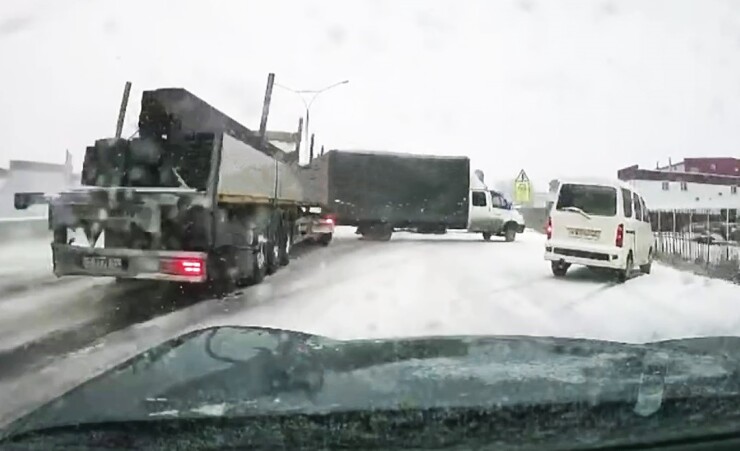 5 ноября на въезде в Барнаул произошло массовое ДТП с участием пяти автомобилей. На видео с регистратора очевидца видно, как на скользкой дороге занесло легковой автомобиль. Водитель КамАЗа не смог затормозить и снёс несколько попутных машин.