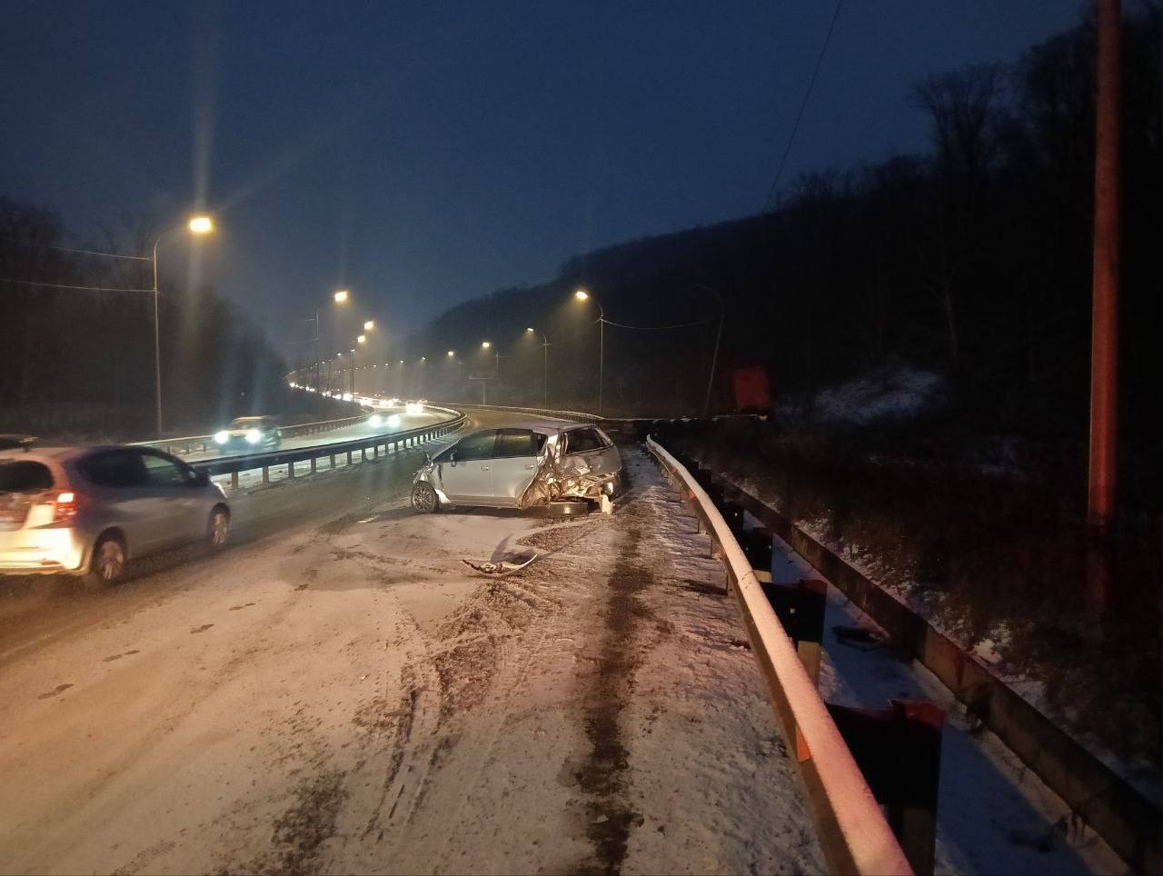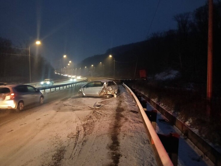 ДТП произошло на трассе Де-Фриз — Седанка — Патрокл» во Владивостоке. 26-летний водитель автомобиля Mitsubishi Colt, двигаясь в направлении Снеговой Пади, совершил столкновение с грузовым автомобилем Volvo, который от удара потерял управление и съехал с дороги в кювет.