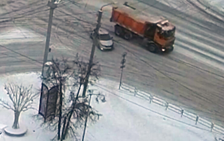 ДТП произошло в Челябинске на пересечении улицы Энгельса и проспекта Ленина. Столкнулись легковой автомобиль и самосвал, перевозивший снег. Момент столкновения попал в объектив камеры уличного видеонаблюдения.