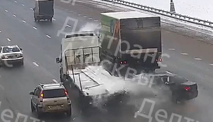 ДТП произошло 28 декабря на 105 километре внутренней стороны МКАД. Легковой автомобиль столкнулся с попутным грузовиком. Информация о пострадавших уточняется. Момент столкновения зафиксировала камера уличного наблюдения.