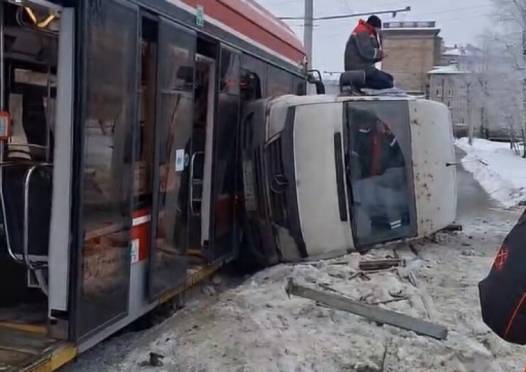 ДТП произошло на Корабельной улице в Санкт-Петербурге. Микроавтобус Mercedes при повороте налево столкнулся с трамваем. Происшествие попало в объектив камеры уличного наблюдения.