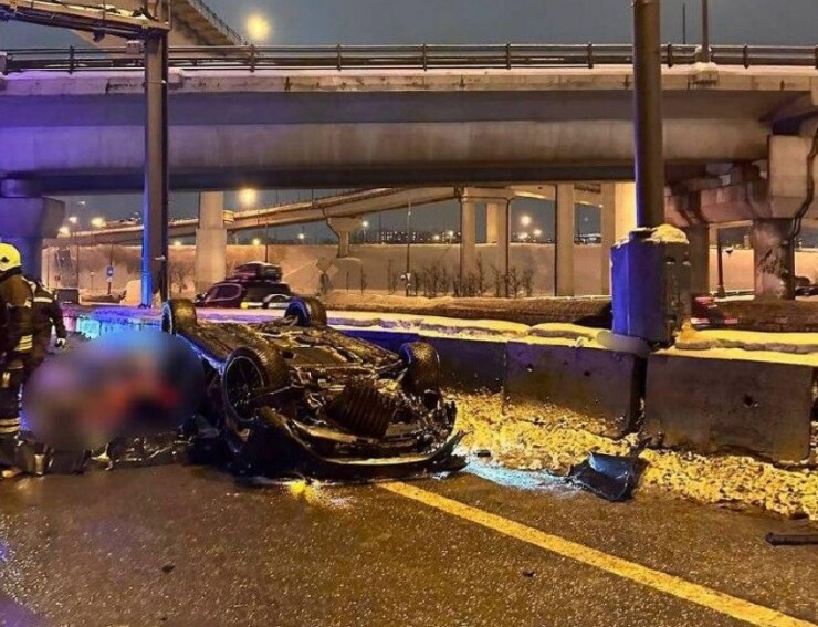 ДТП произошло в районе 77 километра МКАД возле пересечения с трассой М-11. Mercedes-Benz E350 упал с эстакады на проезжавшие мимо машины. Момент падения попал в объектив камер.