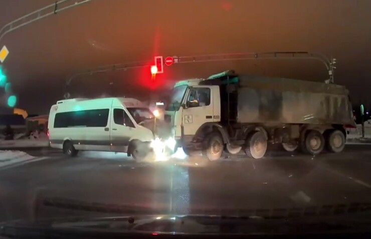Выезд на Мурманское шоссе из Кудрово. На глазах у водителя автомобиля с видеорегистратором столкнулись микроавтобус и грузовой автомобиль. О пострадавших не сообщается.