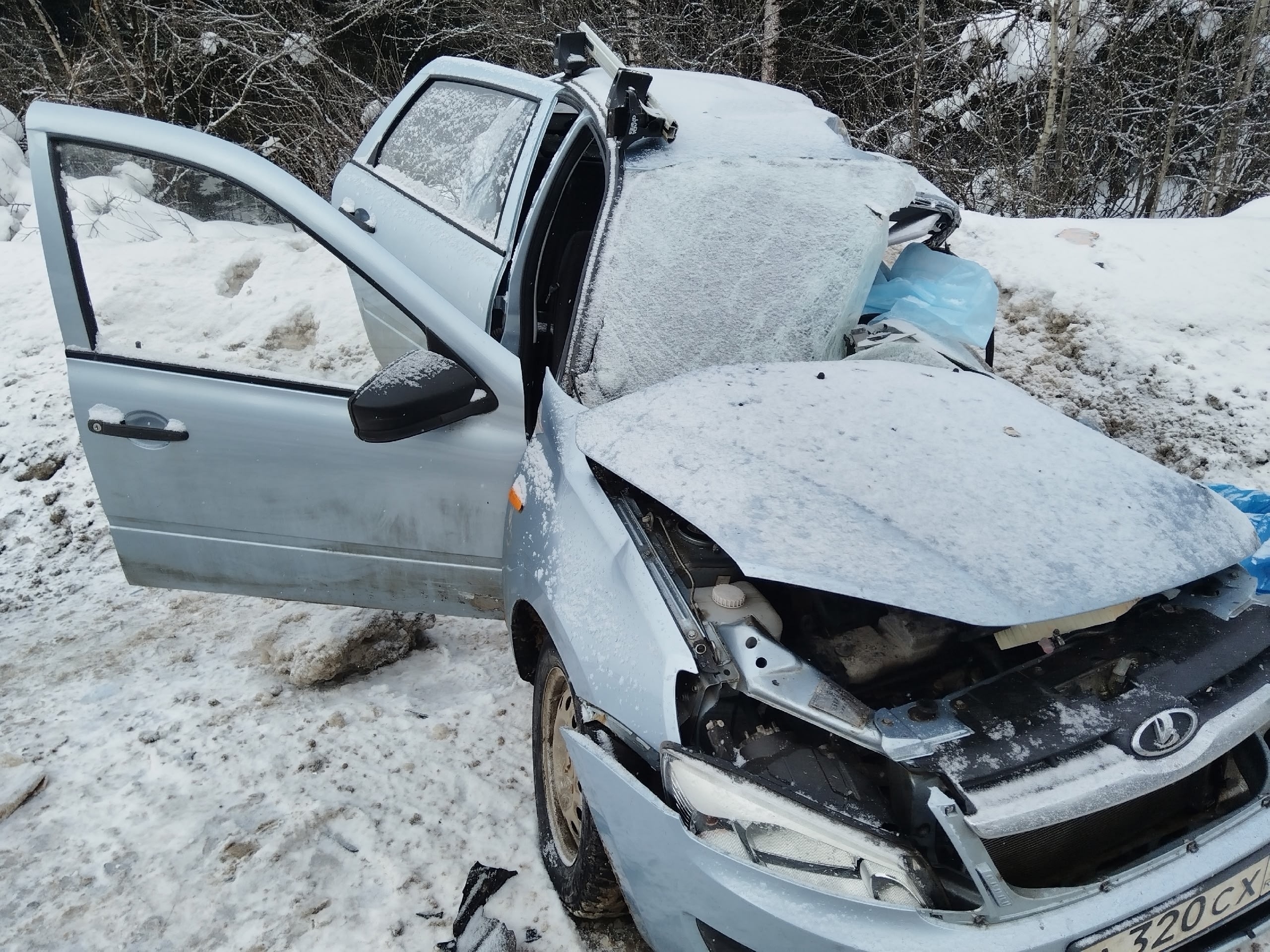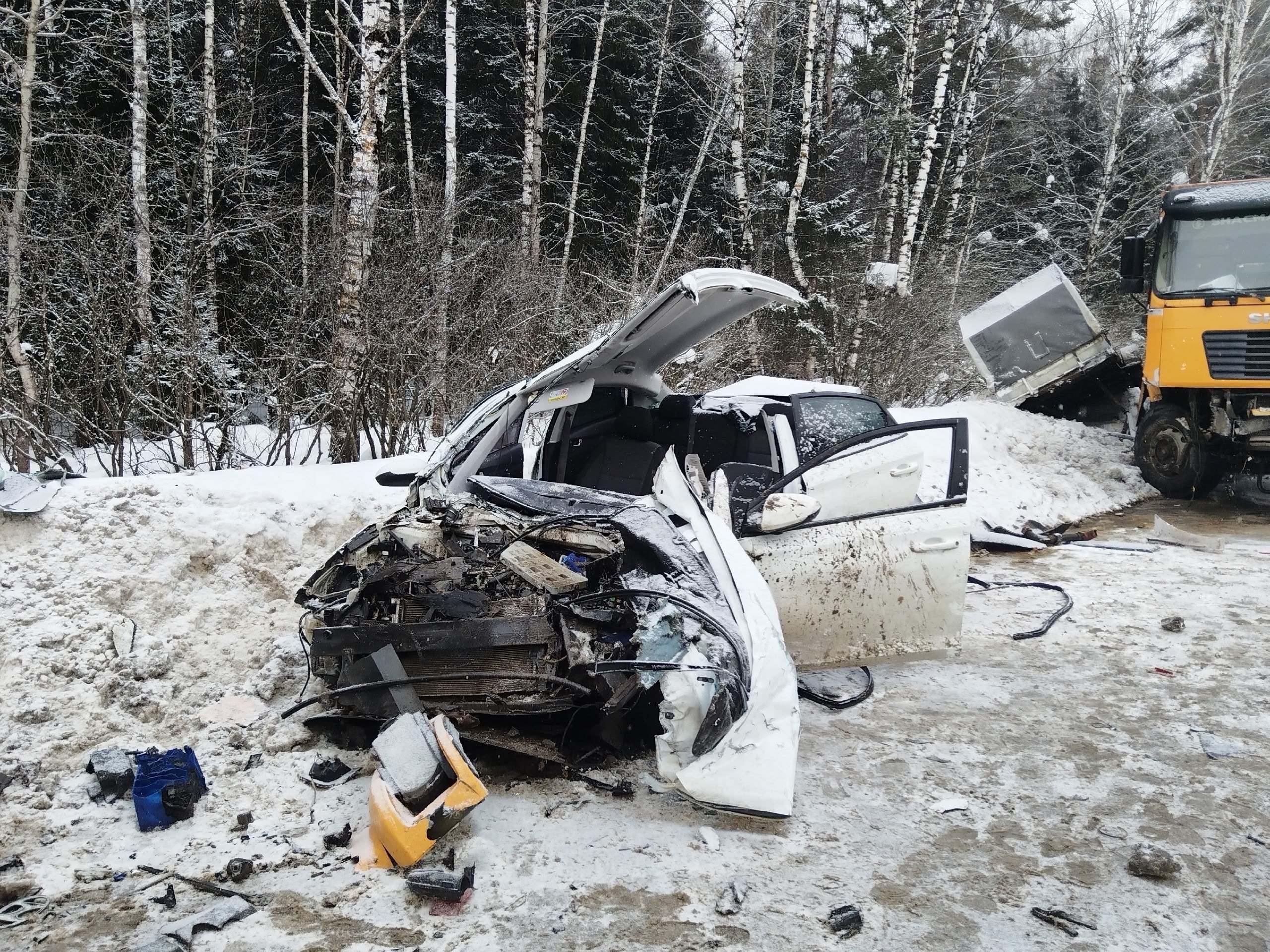 На кадрах с видеорегистратора видно, что в ДТП участвовал еще один автомобиль Hyundai Solaris, следовавший за грузовиком. Находившаяся за рулем женщина попыталась уйти от столкновения и вылетела в сугроб. Информации о ее состоянии на данный момент не поступало.