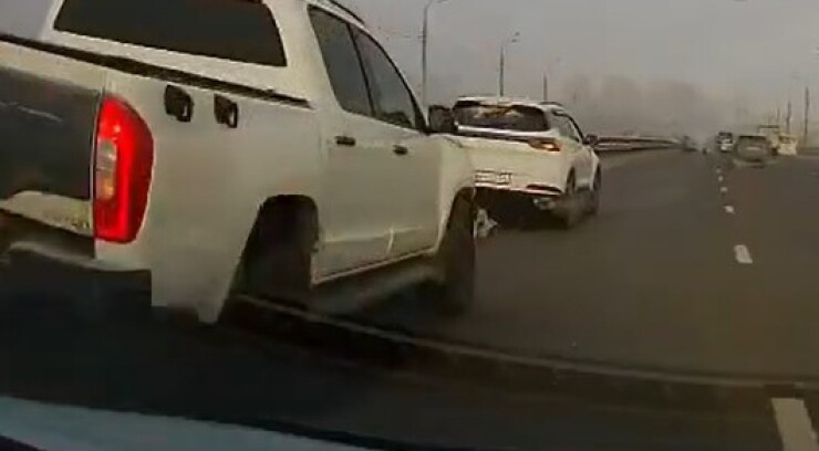 ДТП произошло на Октябрьском мосту в Красноярске. Водитель кроссовера решил поиграть в «шашки» за рулем, но уже на первом маневре проиграл.