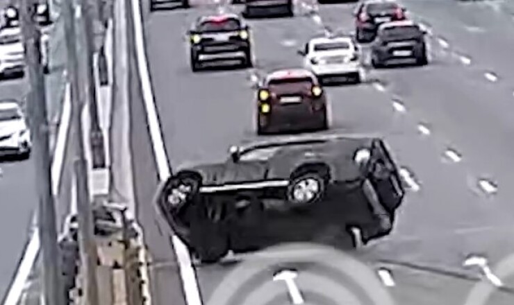 На 60 километре МКАД водитель внедорожника наехал на стык, что привело к разрыву колеса, от которого автомобиль потерял управление, наехал на ограждение и перевернулся.