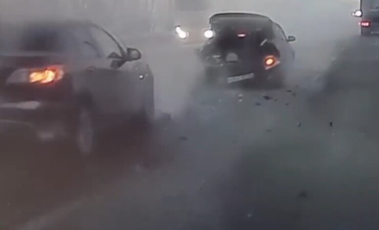 На путепроводе Калинина — Тотмина из-за выхлопных газов грузовика водитель «Мазды» не заметил перед собой другой автомобиль. Момент ДТП запечатлел видеорегистратор очевидца.