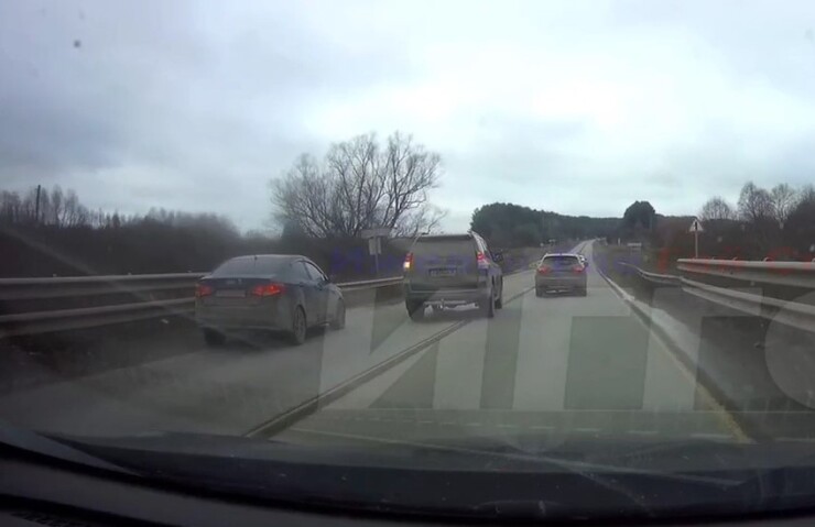 На Нылгинском тракте в Удмуртии водитель внедорожника Toyota Land Cruiser пошел на обгон и подрезал автомобиль, который его обгонял.