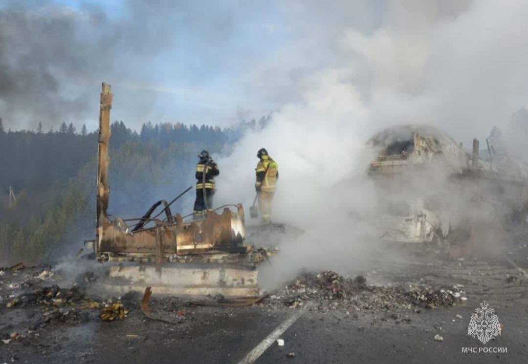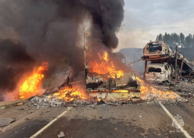 Столкнулись 8 автомобилей, из которых 7 грузовых и одна легковая. Пять автомобилей полностью сгорели, в том числе внедорожники Toyota Land Cruiser, которые находились на автовозе.