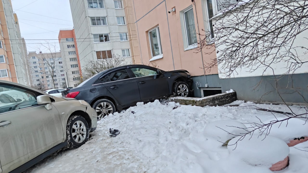 ДТП произошло в одном из дворов по улице Освобождения в Красном Селе. Водитель автомобиля Chevrolet снёс припаркованную у подъезда машину, после чего врезался в жилой дом.