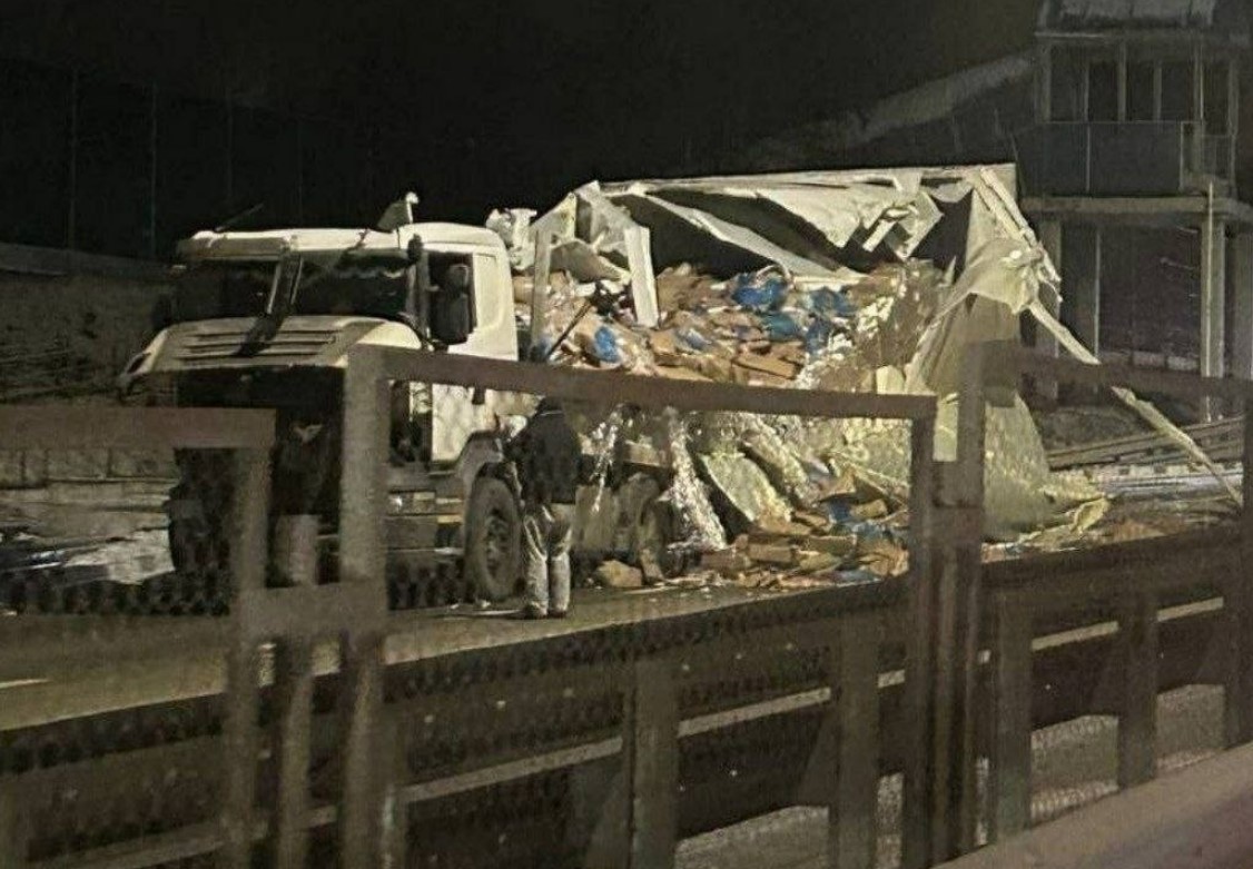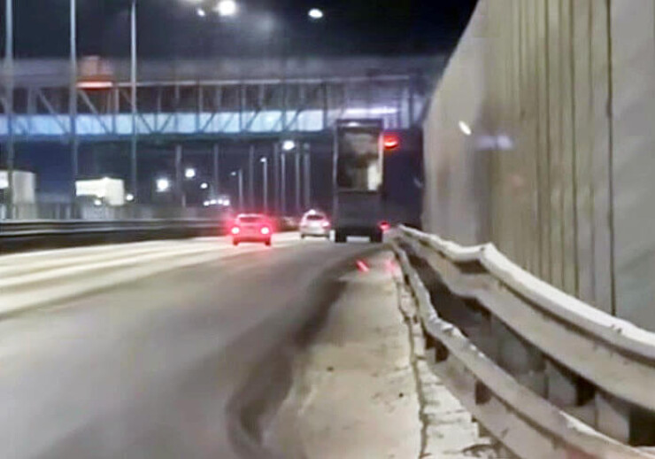 От мощного удара часть сооружения обрушилась на разделительную полосу, а её фрагменты повредили проезжавшие мимо автомобили.