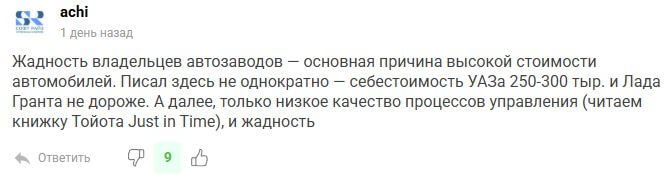 Представьте аналогию из обычной жизни: вы купили квартиру в ипотеку 15 лет назад, сделали ремонт, завезли технику, и все главные траты давно остались в прошлом. Сейчас рынок говорит, что квартира стоит втрое дороже, а вы ходите по знакомым с лицом умирающего от голода и жалуетесь, что живете в ноль. Примерно то же самое, уверен Шапарин, происходит и с заводом: конструкторам больше не платят за создание машины с нуля, конвейер настроен и крутится как часы, каждая следующая машина должна обходиться дешевле, а розничный ценник неумолимо ползет вверх — так куда утекает колоссальная разница?