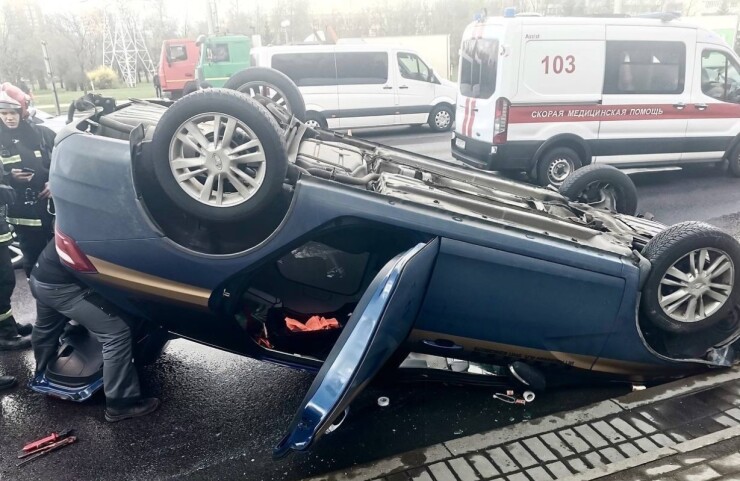 ДТП произошло на Партизанском проспекте в Минске. Вблизи станции метро Могилевская автомобиль такси от столкновения с электрокаром Tesla.