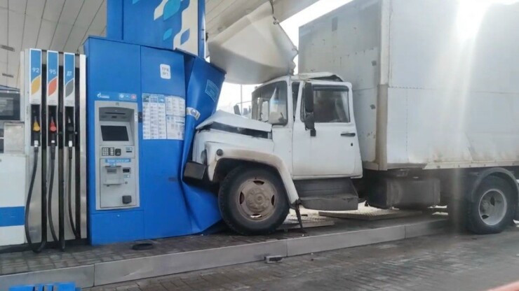 За рулем грузовика ГАЗ находился 62-летний водитель. Мужчина не справился с управлением, допустил наезд на бордюрный камень, после чего машина врезалась в АЗС. Момент ДТП попал в объектив камеры уличного наблюдения.