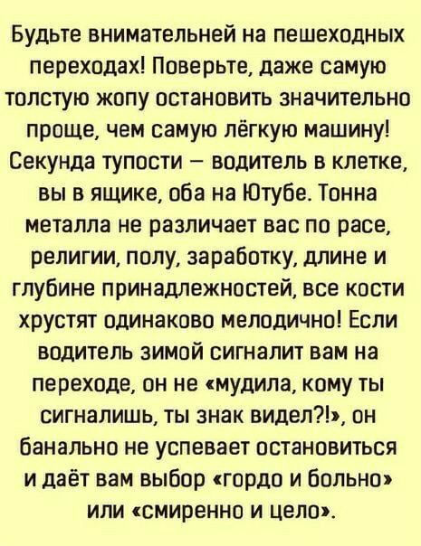 Обращение к пешеходам. Будьте внимательней на пешеходных переходах! Поверьте, даже самую толстую жопу, остановить значительно проще, чем самую легкую машину! Секунда тупости — водитель в клетке, вы в ящике, оба на Ютубе! Тонна металла не различает вас по расе, религии, полу, заработку, длине и глубина принадлежностей, все кости хрустят одинаково мелодично! Если водитель зимой сигналит вам на переходе, он не «Мудила, ты кому сигналишь, знак видел?!» он банально не успевает остановиться и дает вам выбор «Горда и больно» или «Смиренно и цело»!