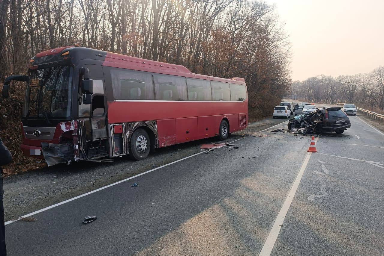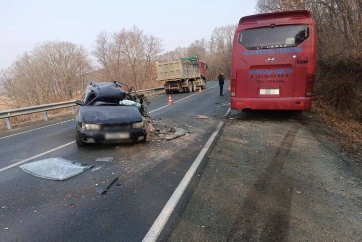 ДТП произошло на 31 километре автодороги Артем — Находка. 60-летний водитель автомобиля Toyota Carib выехал на встречную полосу и столкнулся с автобусом.