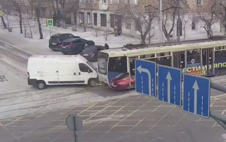 На пересечении улицы Чертенкова и проспекта 50-летия Октября в Улан-Удэ произошло столкновение микроавтобуса с трамваем.