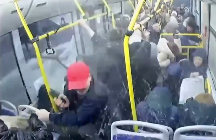Что то как то не вяжется описание с видео. Видно, что автобус дернулся в сторону обочины и девушку кинуло к стеклу. И в этот момент влетает знак….