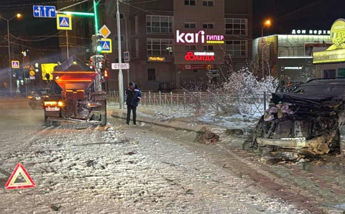 22 ноября рано утром на пересечении улиц Октябрьская и Пояркова в Якутске Lexus на скорости столкнулся со снегоуборочной машиной.