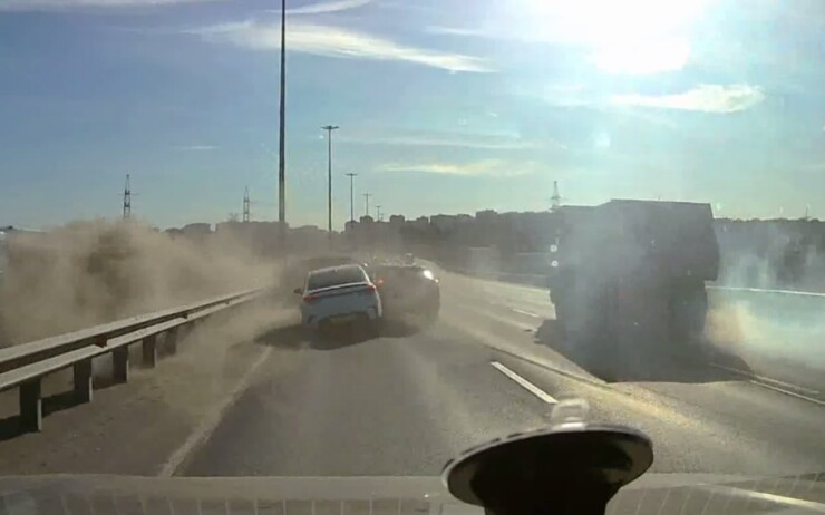 ДТП произошло на внутренней стороне КАД перед Кудрово. На глазах у водителя автомобиля с видеорегистратором столкнулись несколько авто. О пострадавших не сообщается.