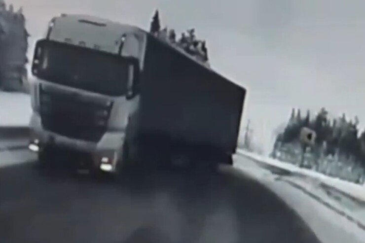 Хороший такой профессионализм — залетать в поворот по льду. Еще небось резина на прицепе лысая. Они любят так. На ведущую ось получше, просто чтобы не застрять. А на прицеп что получится.